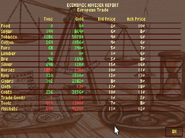 Die Wirtschaftsbilanz unmittelbar vor der Unabhängigkeitserklärung. Fast die Hälfte der Handelseinnahmen wurde mit Silber erzielt. Zweitwichtigste Produktlinie waren Tabak und Zigarren, den beiden Tabak-Spezialressourcen sei Dank. Wie zu sehen, wurde der größte Teil der Einnahmen darauf verwendet, Pferde zu kaufen. Natürlich fehlen hier ein paar große Posten sowohl bei den Einnahmen (Schätze aus den Lost City Rumours, Geschenke der Indianer) als auch bei den Ausgaben (Kolonisten, eine Galeone, eine Spende über 1300 Gold an die Franzosen). |