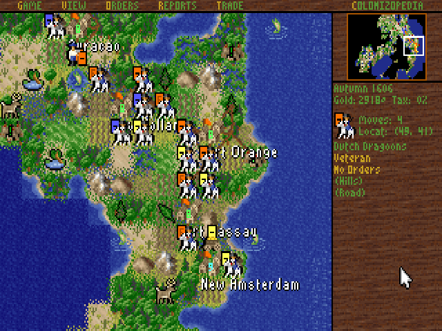 Die 17 Dragoner müssen vor der Unabhängigkeitserklärung intelligent auf die Kolonien verteilt werden. New Amsterdam kann vier von ihnen zur Kavallerie befördern, die übrigen Kolonien jeweils nur drei. Die spanischen und französichen Einheiten verschwinden sofort nach der Unabhängigkeitserklärung. |