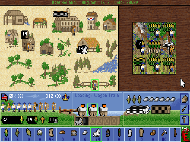 Eine typische Kolonie während des Unabhängigkeitskrieges. Höchste Priorität hat das Wachstum der Pferdebestände, hier 14 im nächsten Zug. Das Wachstum wird, wie sich am Ende zeigt, über 80% der laufenden Verluste durch den Krieg ausgleichen können. Die meisten Kolonisten sind dafür als Farmer tätig. Die Rathäuser sind kaum noch besetzt. Es ist aussichtslos, die 8000 Freiheitsglocken für die (zumal bescheidene) französische Intervention zu sammeln. Die sechs Kolonien könnten zusammen maximal 216 Glocken pro Zug erzeugen, unter Verzicht auf den Großteil des Wachstums der Pferdebestände. Damit würden sie 38 Züge für die 8000 Glocken brauchen. Bis dahin ist der Krieg längst vorbei, ob nun gewonnen oder verloren. (Tatsächlich hat er 15 Züge gedauert.) |
