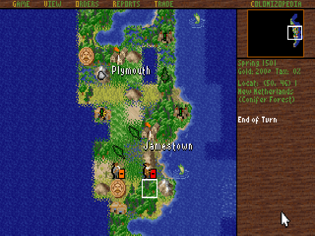 Willkommen in den frühen 90ern. Die vorsintflutlichen Grafiken gehören eben auch zum Erlebnis Colonization. Aus den Lautsprechern klimpert MIDI-Musik. Das Spiel ist 9 Züge alt. Die Strategie für den Spielbeginn ist, einen der Konkurrenten quasi zu schlucken. Im Gegensatz zu den Computergegnern gründe ich mit meinem Soldaten nicht gleich eine Kolonie, sondern erobere mit ihm die fremden, unverteidigten Kolonien. Wie man sieht, hat es die Engländer getroffen, ich spiele mit den Holländern. Ihre beiden Anfangssiedlungen haben die Engländer schon eingebüßt, sie spielen aber munter weiter und liefern neue Kolonisten an, die ich mir allesamt schnappe. Bis 1534 erbeute ich so 7 Kolonisten, 200 Werkzeuge und 100 Musketen. Die eroberten Kolonien sind natürlich nicht optimal gelegen, sie werden deshalb aufgelöst. Zwei Umstände empfehlen das Spiel für einen Rekordversuch: erstens die Silberressource und zweitens die Existenz einer für den Unabhängigkeitskrieg idealen Hafenposition (weißer Rahmen), mittels der sich die königlichen Truppen auf einen Berg zwingen lassen. Der Kampf in idealem Terrain wird viele Pferde sparen. |