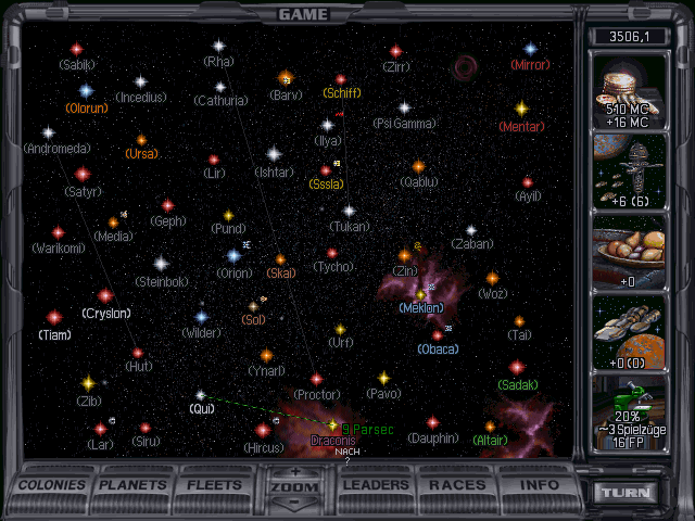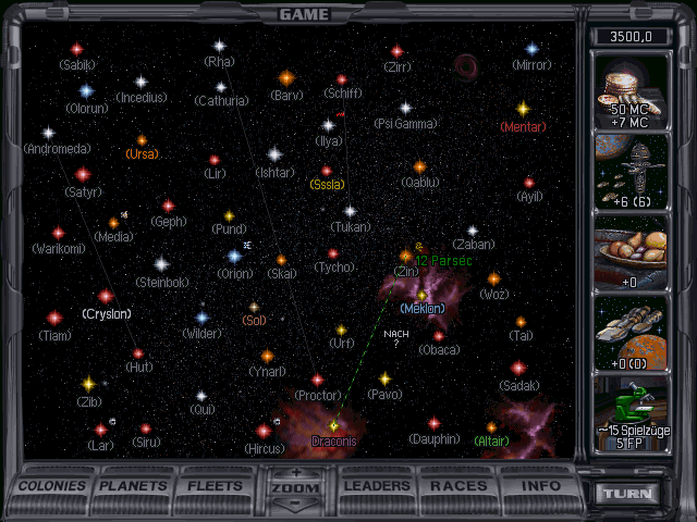 Die Planeten im Umkreis von 6 Parsec sind dagegen jämmerlich. Der beste ist noch der Tundra-Planet mit der Amöbe. Die nächstgelegenen Planeten mit einem Bevölkerungsmaximum über 5 befinden sich in 12 Parsec Entfernung im Zin-System: