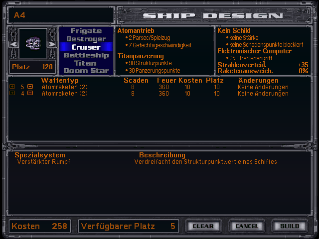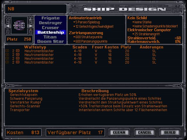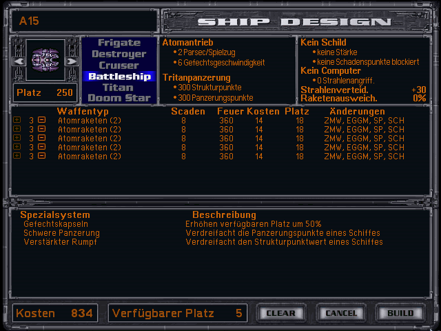 Das Schiff ist erbärmlich, aber Tritanpanzerung, Gefechtskapseln und Mehrfachsprengköpfe sind alle noch nicht erfunden. Ich muss ein Schiff bauen, sonst wirke ich zu schwach.