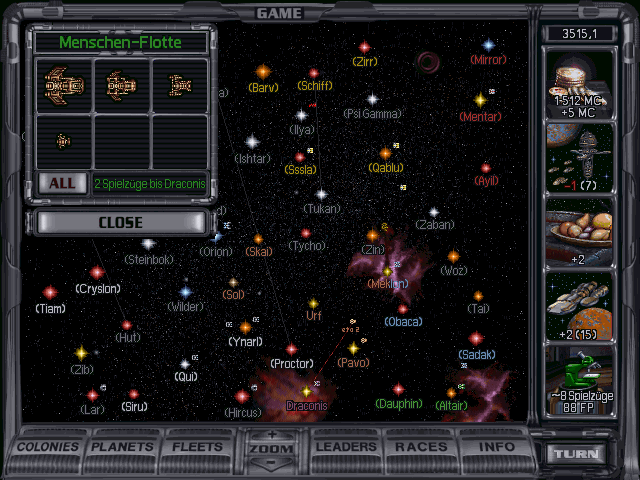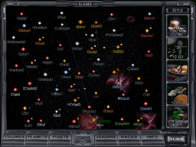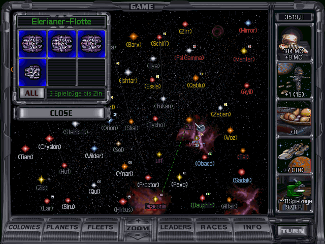 12 Parsec Abstand zwischen zwei Systemen sind verdammt viel, zumal hier noch zwei Nebel dazwischen liegen. Man kann für lange Zeit nicht beide Systeme mit der gleichen Flotte verteidigen. Aber das Zin-System ist wohl meine einzige Chance. Ich muss es mir holen. Es müssen zwei Außenposten errichtet werden, um mit Kampfschiffen dort hin zu gelangen. Der Drache verhindert eine Zeit lang eine Kolonisierung durch die Gegner, ich muss also nicht in Hektik ausbrechen.