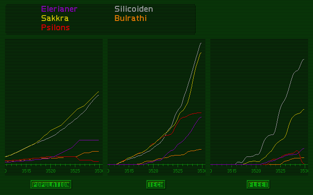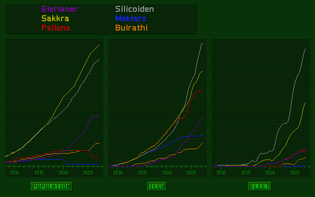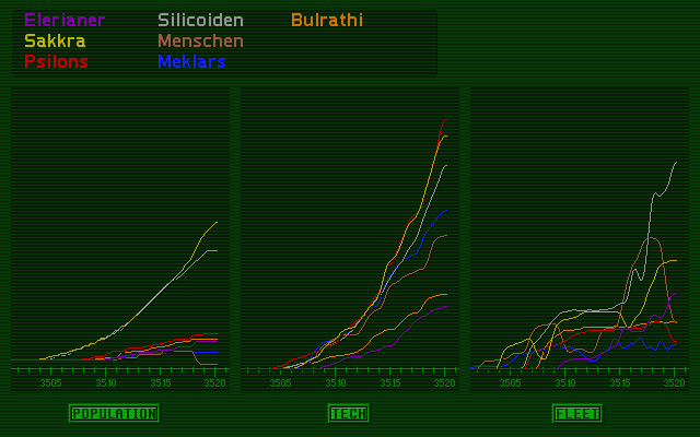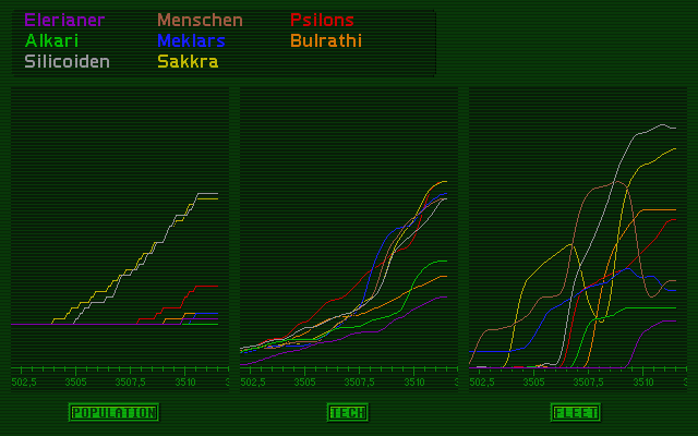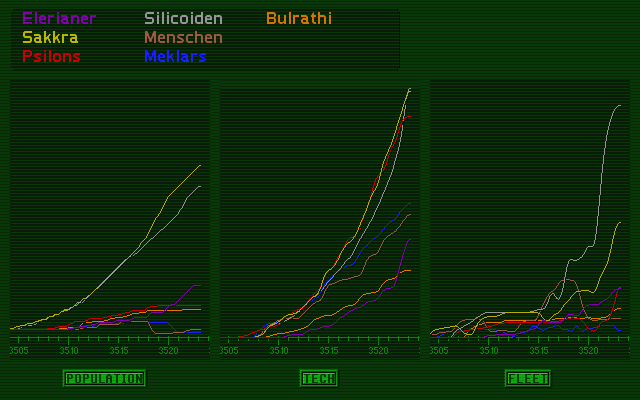 (Nachtrag: Nach statistischer Auswertung aller Spiele der Versuchsreihe lässt sich bestätigen, dass die aberwitzige Stärke der Gegner in diesem Spiel real ist und nicht etwa eine Täuschung durch die Schwäche der Elerianer. Die Silicoiden-Flotte ist drei bis vier mal so groß wie die typische stärkste Flotte der Galaxis zu diesem Zeitpunkt.)