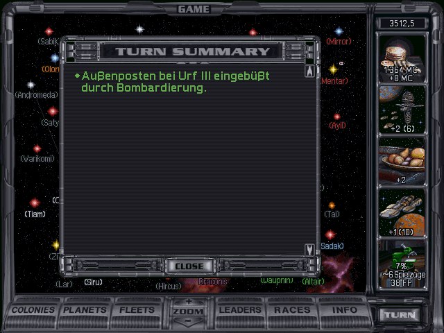 Die Menschen kündigen aus heiterem Himmel alle Verträge und erklären mir den Krieg. Das kommt extrem ungelegen. Ich werde das Zin-System nicht besiedeln können, wenn ich mit einem der Nachbarn im Krieg bin. Meine Flotte ist langsam, gemessen an den Entfernungen, dazu kommen die beiden Nebel, und ich habe keinen Navigator. Ich kann nur mein Heimatsystem verteidigen, nicht die Außenposten, die ich brauche, um nach Zin zu kommen, und auch nicht Zin selbst.