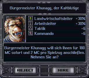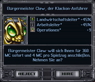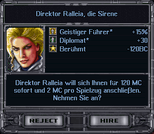 Ralleia ist in diesem Spiel überflüssig. Ich habe schon einen Arbeitsleiter und einen Wissenschaftsleiter, außerdem auch schon einen berühmten Diplomaten, nämlich Garron. (Nachtrag: Diese Argumentation ist im Rückblick zweifelhaft, denn irgendwann hat man mehr als drei Kolonien, und dann nützt Ralleia als Geistiger Führer mehr als Garron. Ich hätte statt dessen Garron entlassen sollen.)