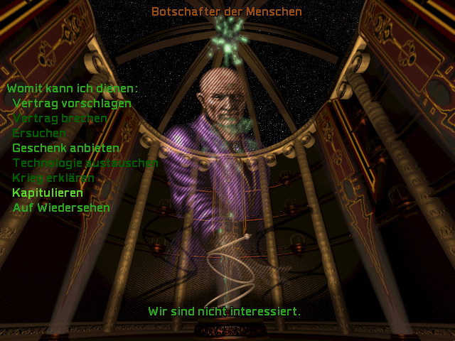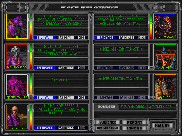 Um meinen Aktionsradius zu vergrößern, schlage ich den Alkari eine Allianz vor, aber sie lehnen ab. Hinterher wird mir klar, dass das sowieso keine gute Idee war, weil es mir erstens relativ wenig genützt hätte und sich die Alkari zweitens ständig mit den Meklars befehden. Mit noch einem weiteren Krieg gegen einen weiteren Nachbarn wäre das Spiel wohl endgültig verloren.