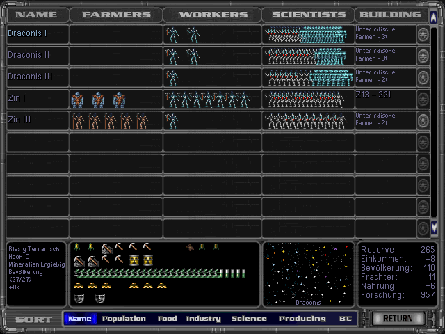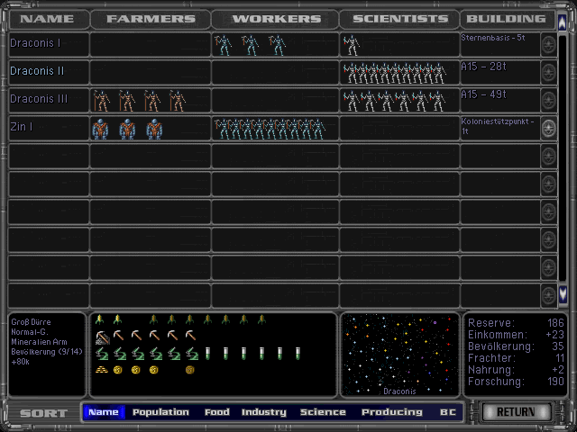 Mit Zin I habe ich endlich einen produktiven Planeten. Die Kolonien spezialisieren sich jetzt. Kirsus bleibt beim Heimatsystem, Claw geht nach Zin.