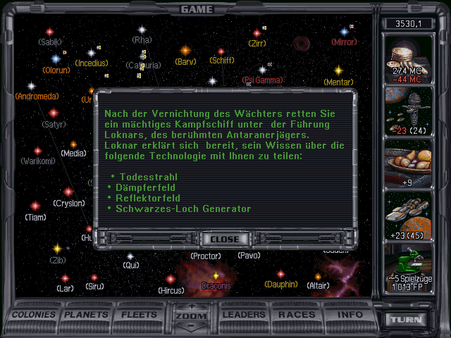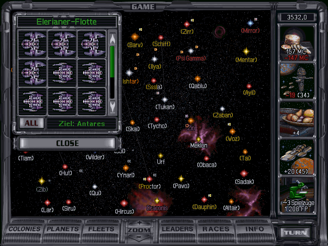 (Nachtrag: Ich habe später doch einmal versucht, das Spiel ab dieser Stelle als Eroberungsspiel weiter zu spielen, statt nach Antares zu flüchten, weil ich wissen wollte, wie das gegen so starke Gegner ausgeht. Immerhin habe ich ja einen großen Trumpf in Form des Dämpferfelds. Wie befürchtet, kommt es bald zum Krieg gegen einen der starken Gegner. Zum Glück sind es nicht die Silicoiden, sondern die etwas schwächeren Sakkra. Es dauert nur etwa 20 Züge, und sie erklären mir den Krieg und greifen mich mit einem Verband aus 40 Schlachtschiffen und 8 Todessternen an. Allerdings ist in diesen 20 Zügen viel passiert. Die Elerianer haben sich das Reich der extrem schwachen Bulrathi (Titanpanzerung!) einverleibt und einige künstliche Planeten erschaffen, weshalb sie nun mehr als 20 Kolonien haben. Sie haben die Konföderation (billige Schiffe!) und sind per Evolutionsmutation zu Kriegsherren geworden (Kommandopunkte!) und konnten deshalb massiv aufrüsten. Es gelingt, die Sakkra abzuwehren und anschließend den Spieß umzudrehen und sie zu unterwerfen. Die Silicoiden bleiben bei diesem Test friedlich und verpassen so ebenfalls den Punkt, an dem sie mich noch hätten besiegen können.)