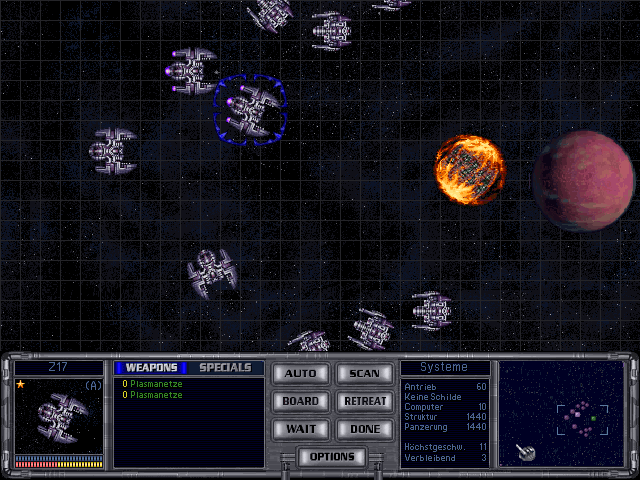 Die Antaraner greifen wieder an, diesmal mit einem einzelnen Zerstörer. Trotz Warpfeld-Begrenzer habe ich nur zwei Züge Zeit. In diesen zwei Zügen könnte ich in dem System nur zwei Schlachtschiffe mit Enterfähren bereitstellen, was bei einer Bodenkampfstärke von 55 zu wenig ist gegen einen Zerstörer. Ich kann mir den Kaperversuch also sparen.