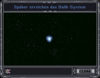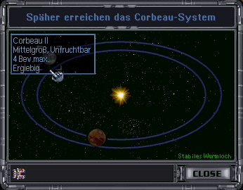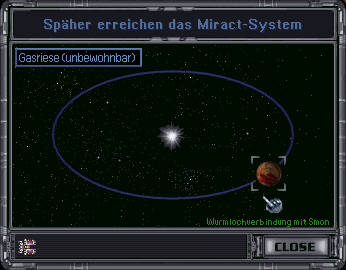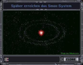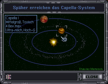 Ein Späher fliegt aus und erkundet das erste fremde System. Es gibt dort ein Wurmloch.