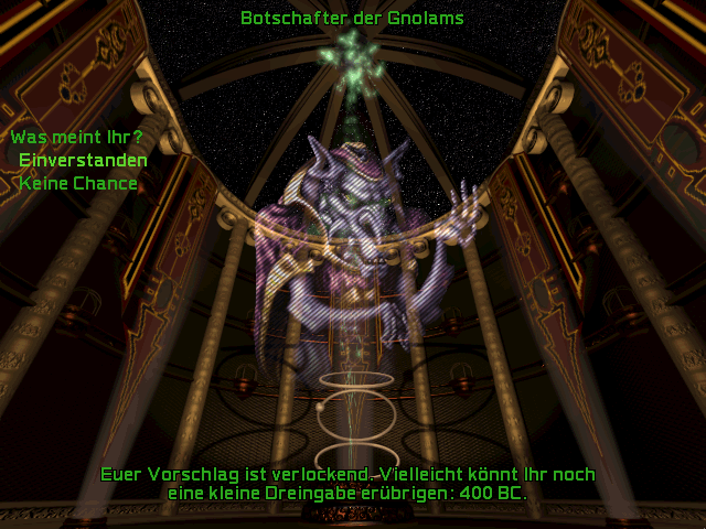 Tausch 10: Von den Alkari erhalte ich den Ionenantrieb gegen Androidenwissenschaftler. Das ist bescheiden, aber etwas Wertvolleres haben die Alkari einfach nicht. Noch trauriger ist die Situation bei den Gnolams, die ich erst gar nicht nach einem Tauschgeschäft frage, weil ich schon sehe, dass sie nichts Brauchbares haben.