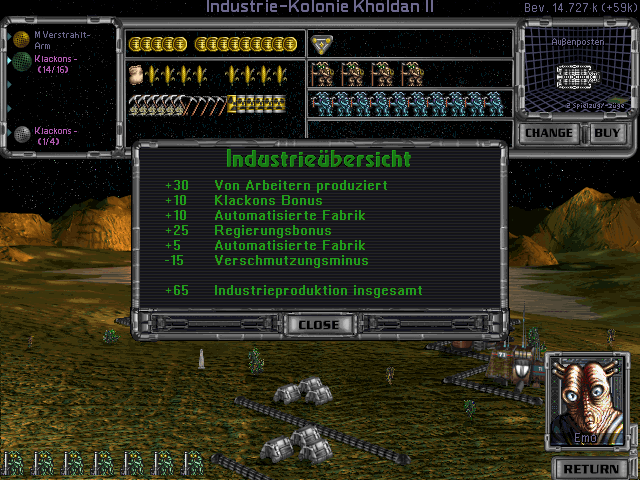 Das ist schon sehr beeindruckend, was die Klackons da treiben. Bei einer normalen Rasse wären 7 der 14 Kolonisten mit der Nahrungsversorgung beschäftigt, und die übrigen 7 würden mit automatisierter Fabrik und Verschmutzungsprozessor etwa 30 Produktionseinheiten pro Zug herstellen. Die Klackons kommen hier auf 65.