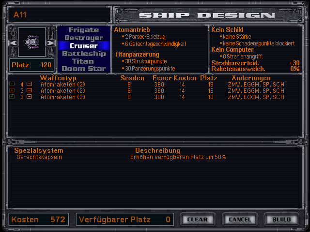 Tausch 5: Ich erhalte den verstärkten Rumpf gegen Gefechtskapseln. Das im Bau befindliche Schlachtschiff wird entsprechend geändert und ist damit nur noch ein großer Witz statt eines gigantischen.