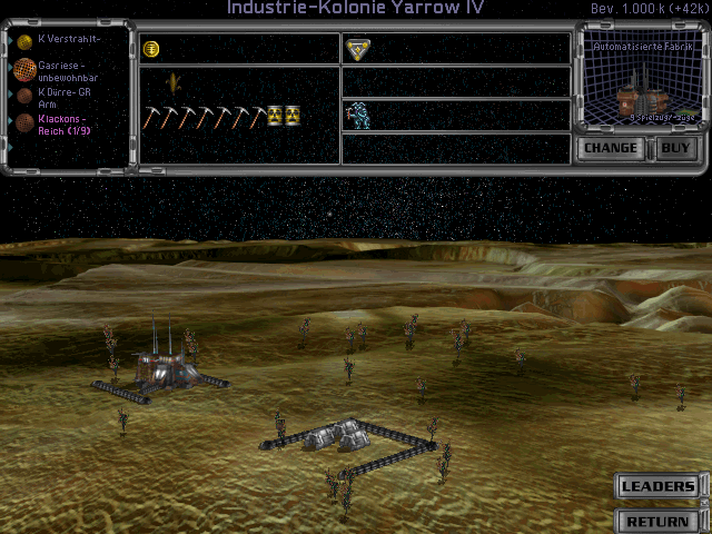 Die zweite wichtige Frage: Gibt es den Verschmutzungsprozessor? Ohne Verschmutzungsprozessor sind die Klackons nicht nennenswert produktiver als eine normale Rasse mit Verschmutzungsprozessor, d.h. sie haben dann gegenüber den Gegnern nur noch Nachteile, abgesehen vom schnellen Start durch die hohe Nahrungsproduktion. In dieser Hinsicht kann aber Entwarnung gegeben werden, die Technologie ist da.