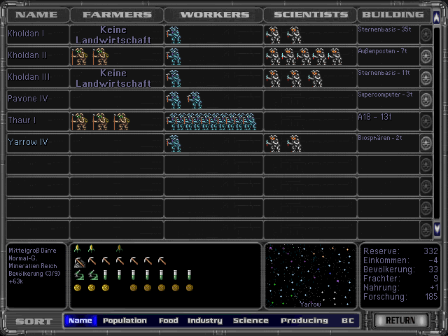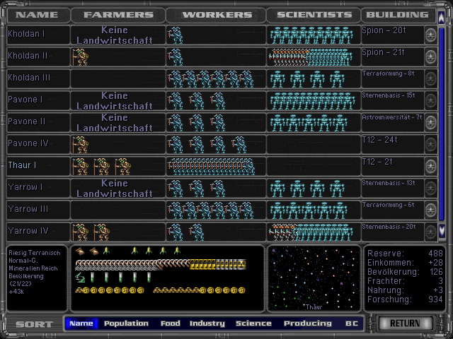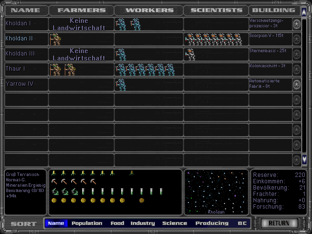 Ich beginne wieder, intensiv zu forschen. Das ganze Kholdan-System mit Emo als Leiter wird zukünftig in erster Linie forschen. Das reiche Thaur I wird weiterhin Schiffe produzieren. Die Kolonien spezialisieren sich.