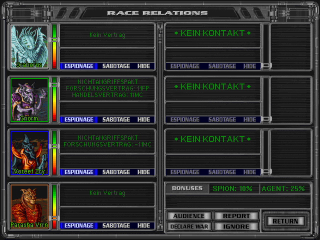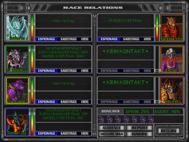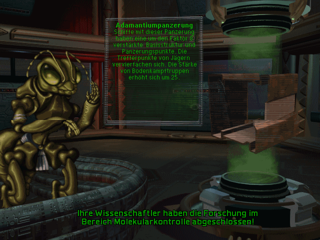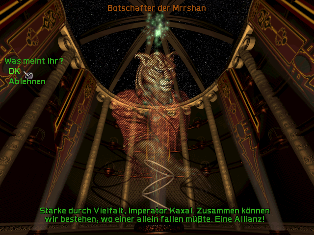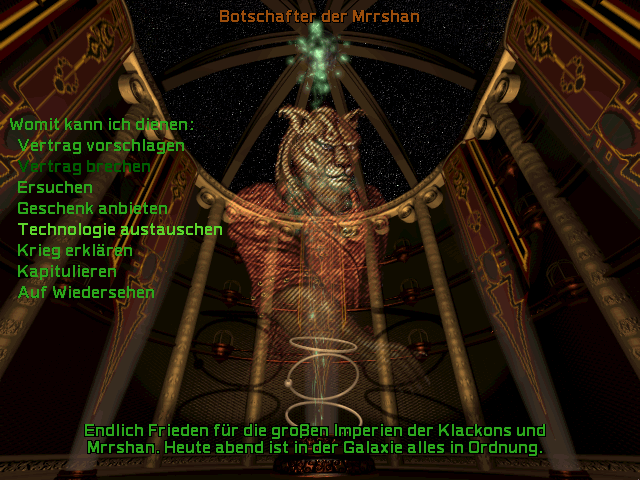 Die Mrrshan schließen schon wieder Frieden. Mehr als den Neutronen-Scanner wollen sie dafür nicht haben. Frieden mit den Mrrshan ist eine gute Sache, weil sie die mit Abstand fortgeschrittenste nicht-abstoßende Rasse sind. Ich erhoffe mir weitere nützliche Technologien von ihnen. Wenn ich erobern wollte, dann wäre jedes andere Volk ein intelligenteres Ziel.