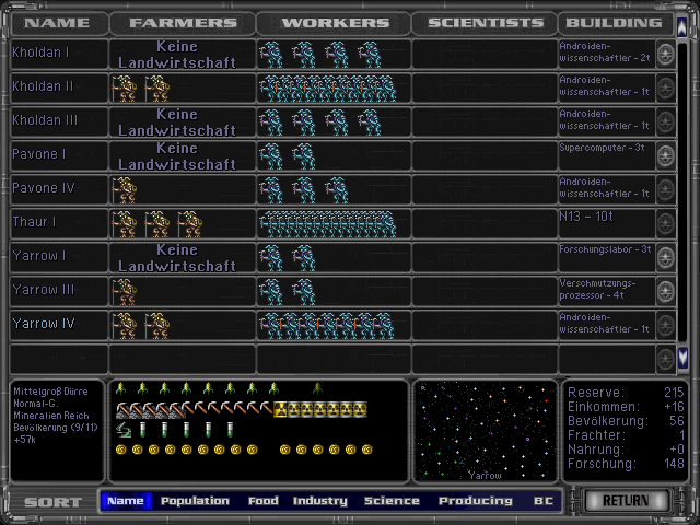 Die Planeten haben sich langsam dem jeweiligen Bevölkerungsmaximum genähert, die Androiden kommen sehr gelegen. Alle Planeten außer den Industriekolonien werden jetzt bis zum Anschlag mit Androiden gefüllt, und danach wird alles terraformiert, was sich terraformieren lässt. Leider sind 3 meiner 9 Planeten verstrahlt und werden es wohl auch bleiben.