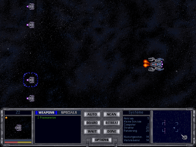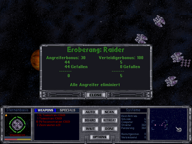 Leider zeigt sich, dass eine Bodenkampfstärke von 30 gegen die Antaraner doch zu wenig ist. Meine Verluste sind 280 mal so hoch wie deren. Ich kann keine der Fregatten erobern und muss alle drei mit den Todesstrahlen der Sternenbasis zerstören. Sehr schade.