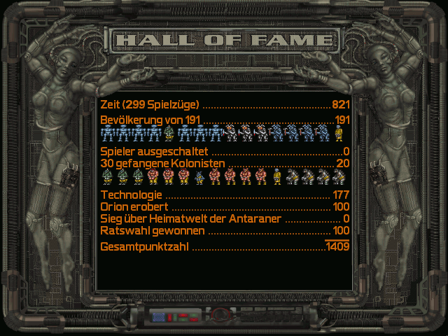 Das war's auch schon. Ich bekomme die Stimmen aller Rassen, außer natürlich die der Sakkra. Das sind stolze 77%. Sieg nach 299 Zügen. Nach 299 Zügen hatte ich mit den Bulrathi noch nicht einmal den Orion besiedelt. Wie meistens, wenn man die Führerwahl gewinnt, ist das Spiel auch so entschieden, und man hätte die komplette Galaxis erobern können.