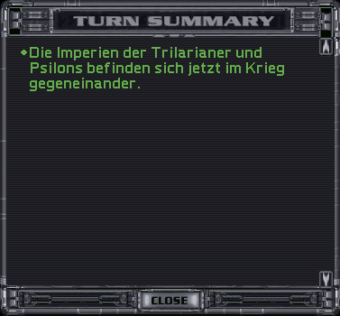 Tausch 8: Von den Psilons bekomme ich die ersehnte Tritanpanzerung gegen den Cybertronikcomputer. Auf weitere Tauschhandel lassen sie sich nicht ein. Direkt im nächsten Zug kapitulieren die Psilons gegenüber den Mrrshan, womit diese in den Besitz aller Psilon-Technologien gelangen, einschließlich natürlich des Cybertronikcomputers. Damit war die Suche nach den Psilons komplett sinnlos, denn den einzigen Tausch, den sie mir ermöglicht hat, hätte ich mit dem gleichen Ergebnis mit den Mrrshan tätigen können.