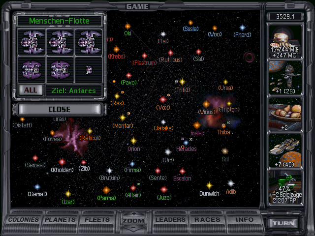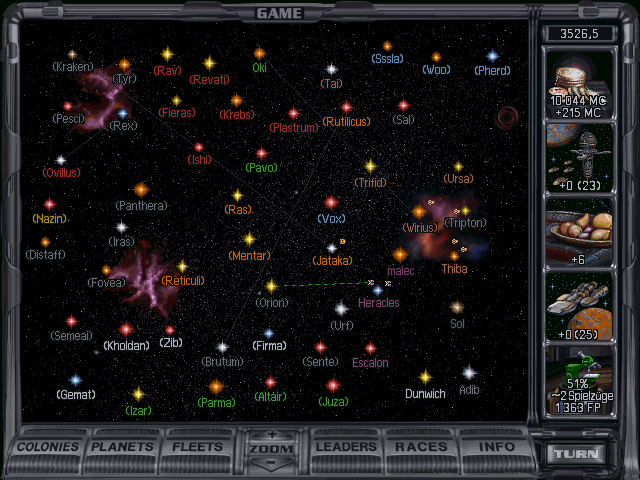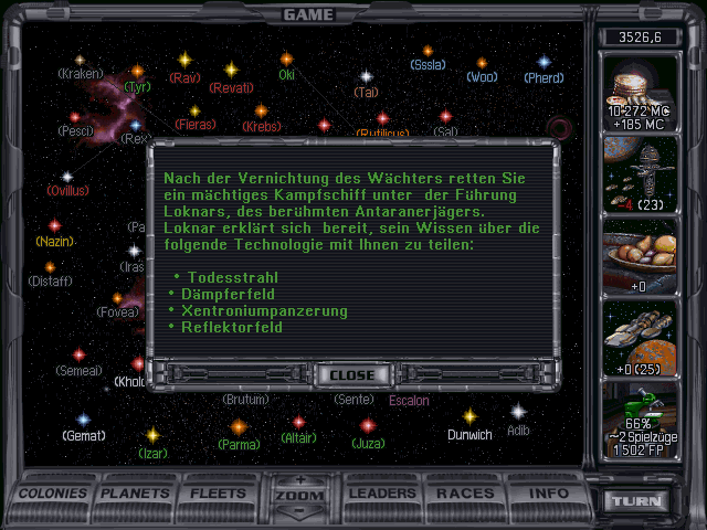 Orion-Punkt, Zusammenfassung des Verlaufs zu Spielbeginn: Meine Standardstrategie hat funktioniert, es gab in 6 Parsec Entfernung ein Monstersystem, Heracles, mit einem großen, reichen, terranischen Planeten. Leider war das Monster diesmal eine Hydra, weshalb ein Schlachtschiff nötig war, und schneller Bau von Schiffen ist bekanntlich eher nicht die Stärke der Menschen. Daneben habe ich noch ein drittes System besiedelt, Escalon, mit drei größeren verstrahlten und unfruchtbaren Planeten. Dieses System hat bisher nur Kosten verursacht, die Planeten werden gerade terraformiert. Dank Kronos ist schon die gesamte Galaxis bekannt.