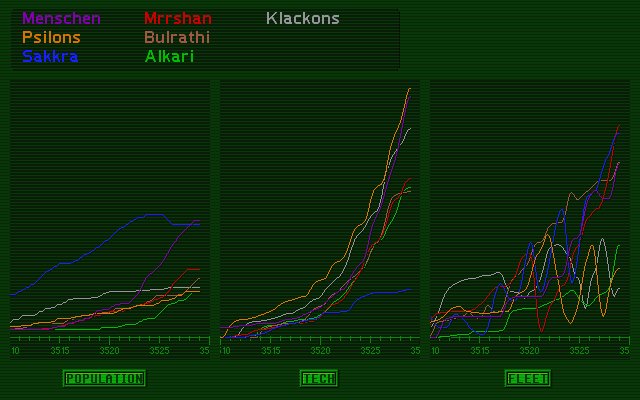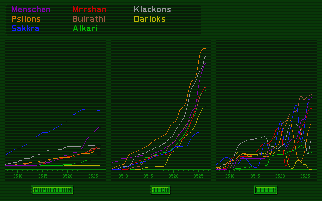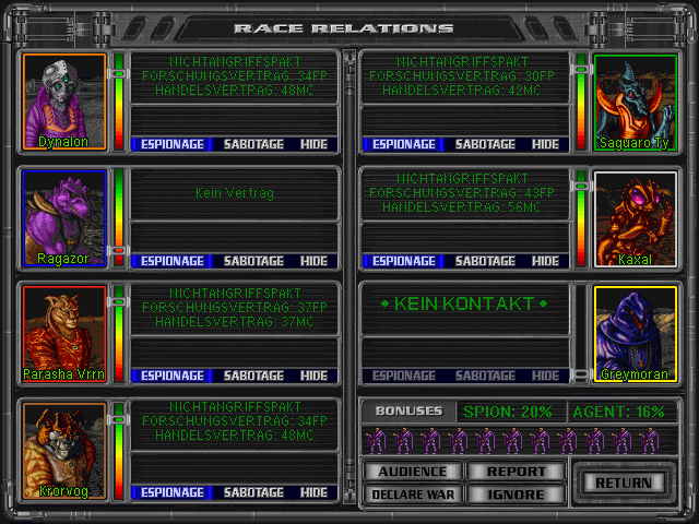 Wie mit den Menschen fast zu erwarten, sind alle Völker befreundet. Nur die abstoßenden Sakkra sind feindselig, aber sie sind in diesem Spiel nicht sehr stark und fallen auch technologisch schon zurück.