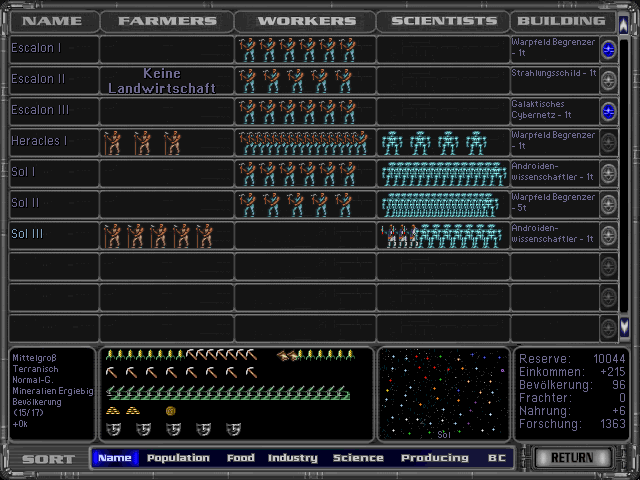Mit Demokratie liegen die Steuern um 50% höher, dazu kommen die vielen Handelsverträge, und einen Händler habe ich auch. Das Ergebnis ist: Ich schwimme im Geld. Zuerst habe ich wieder den gleichen Fehler gemacht wie im Spiel mit den Gnolams und das Geld in der Kasse versauern lassen, aber das ist jetzt vorbei. Ich kaufe jede Produktion, sobald der Preis aufs Dreifache der fehlenden Herstellungspunkte gesunken ist. Die Forschung ist mit Demokratie natürlich sehr stark, alleine die Androiden und Forschungseinrichtungen bringen 1300 Punkte pro Zug.