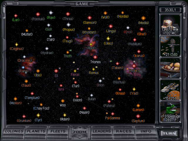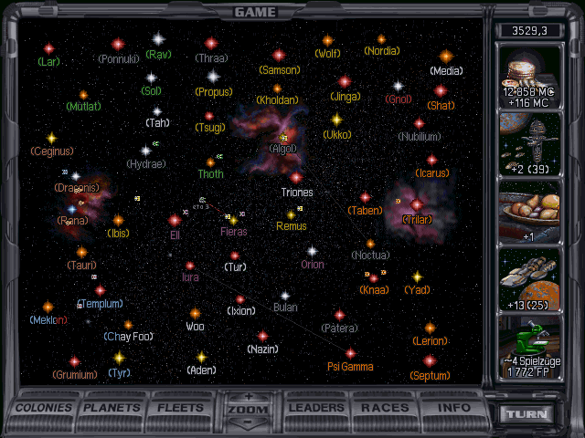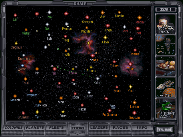 Orion-Punkt, Zusammenfassung des Verlaufs zu Spielbeginn: Das Spiel verläuft seltsam, und das hat mit den Besonderheiten der Mrrshan überhaupt nichts zu tun. Ungewöhnlich ist schon die Lage des Heimatsystems Fieras im Zentrum der Galaxis. Das hat den Vorteil, dass man sich nicht sehr anstrengen muss, um Kontakte zu anderen Völkern zu knüpfen. Der Nachteil überwiegt das aber bei weitem: Man befindet sich frühzeitig in der Reichweite vieler potenzieller Feinde. Insgesamt habe ich mit mittigen Startpositionen eher schlechte Erfahrung gemacht und war hier entsprechend entsetzt.