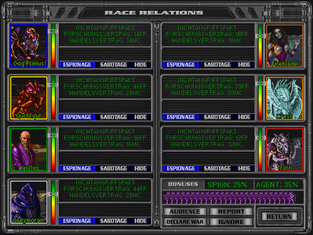 Die dritte Besonderheit des Spiels ist, dass es keine abstoßende Rasse gibt. Alle acht Völker können Deals eingehen und Verträge schließen. Mittlerweile hat auch jeder zu jedem Kontakt. Für Autolabor und Androidenwissenschaftler habe ich jeweils 6 oder 7 Technologien eingetauscht. Die Handelsverträge machen 60% meiner Einnahmen aus und die Forschungsverträge 20% meiner Forschung.
