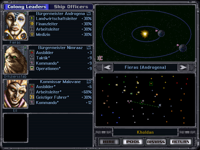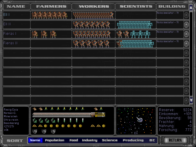 Nicht ganz gewöhnlich sind auch die Kolonien. Nur vier Kolonien haben 98 Kolonisten. Außer meinem Heimatplaneten sind alle Planeten riesig und dank Terraforming inzwischen terranisch.