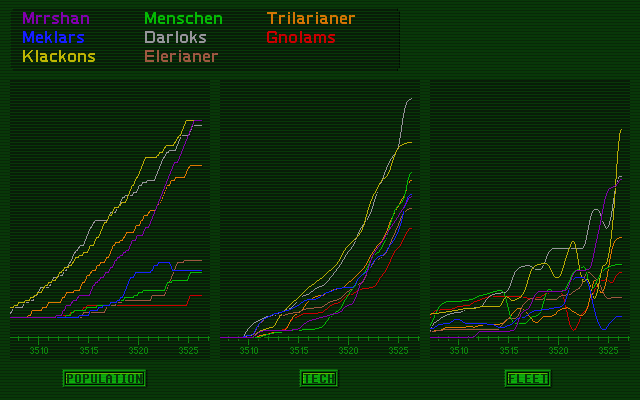 Ich will möglichst viel erobern, bevor die Gegner Warpfeld-Begrenzer, Artemis-Systemnetze und Barriereschilde haben. Im Moment haben sie noch nichts davon. Die Frage ist: Welches Imperium sollen sich die Mrrshan als erstes einverleiben? Normalerweise bietet sich eins an, z.B. weil man sich schon im Krieg mit ihm befindet, oder weil die Rasse abstoßend ist und damit wenig "nützt", oder weil das Reich eine extrem große Bevölkerung hat und deshalb bei den Führerwahlen gefährlich wird. Nichts davon ist hier der Fall, die Gegner sind sich zum Verwechseln ähnlich. Rachegelüste legen die Darloks nahe, aber mit den Darloks und ihren Tarnschiffen möchte ich mich ungern anlegen, bevor die Mrrshan per Evolutionsmutation allwissend geworden sind. Alle Gegner haben Sternenfestungen. Strahlungsschilde haben alle außer den Gnolams und den Klackons. Da die Klackons zudem eine der größten Bevölkerungen in der Galaxis haben, entscheide ich mich für sie.