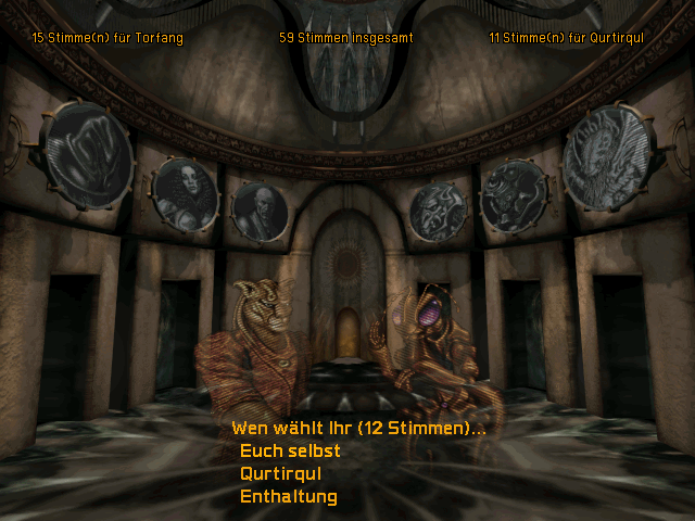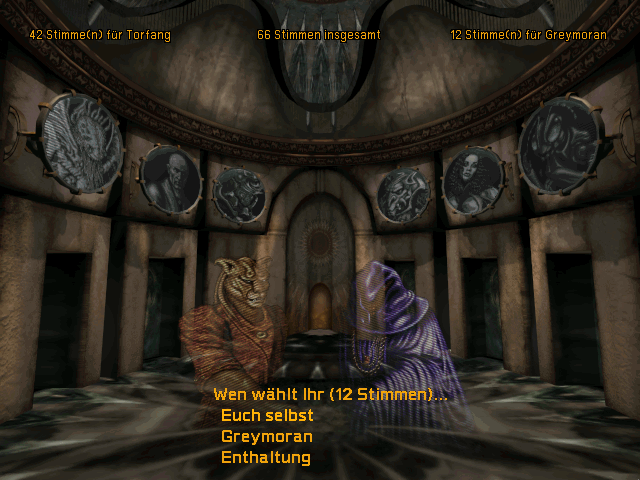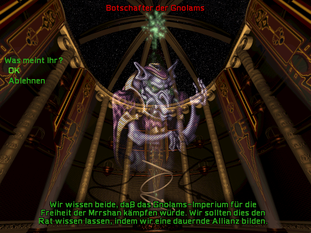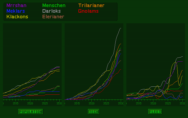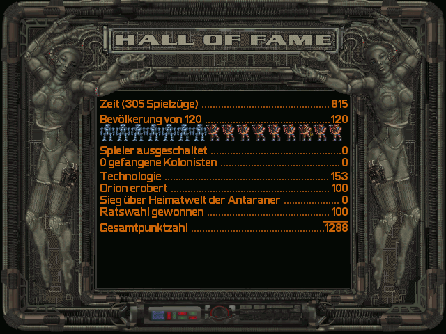 Aber soweit kommt es gar nicht mehr, das Spiel endet friedlich. Ich bekomme bei der Führerwahl sämtliche Stimmen außer denen des zweiten Bewerbers, was 82% ergibt. Auch die Klackons, die von meinen finsteren Plänen nichts ahnen, stimmen für mich. Ich siege nach 305 Zügen mit nur 5 Kolonien ohne jeden Kampf mit den Gegnern.