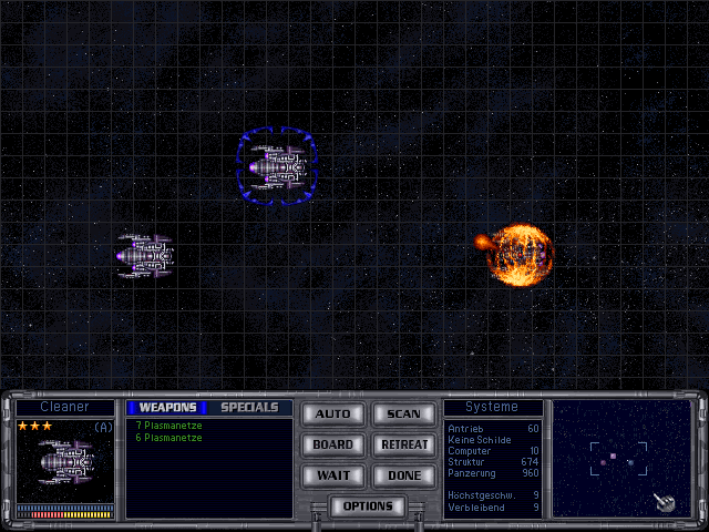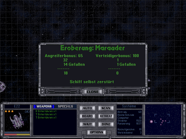Ein Angriff der Antaraner mit einem einzelnen Zerstörer, mir bleiben 3 Züge Zeit. Meine Bodenkampfstärke liegt bei 65, das sollte genügen, um das Schiff zu erobern. Ich rüste schnell zwei Titanen auf Enterfähren um. Vielleicht komme ich so an die Xentronium-Panzerung oder den Molekulartronikcomputer.