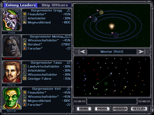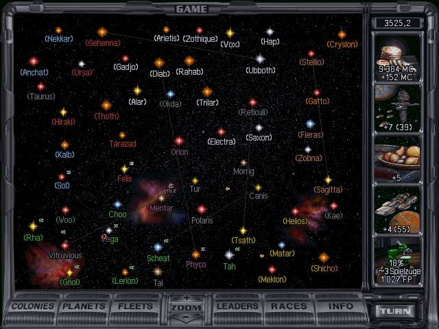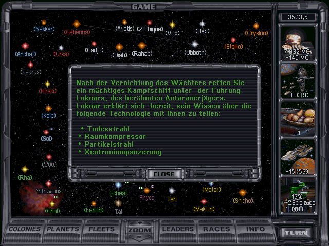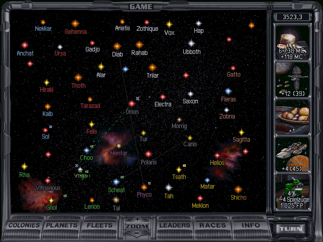 Orion-Punkt, Zusammenfassung des Verlaufs zu Spielbeginn: Meine Standardstrategie hat nicht funktioniert, weil es keine brauchbaren Monstersysteme gab. Wie zum Hohn war das einzige Monster wieder eine Amöbe mit einem unfruchtbaren Planeten, wie schon im Spiel mit den Darloks. Statt dessen gab es aber im Phyco-System einen großen Gaia-Planeten ganz ohne Monster, den ich mir sichern konnte. Ungünstig ist nur das Wurmloch direkt zu einer Kolonie der Trilarianer (in Weiß), die in diesem Spiel abstoßend und sehr stark sind. Außerdem ist der Planet nur ergiebig und war deshalb wegen des Gravitationsmalus zunächst einmal unproduktiver als der Heimatplanet.