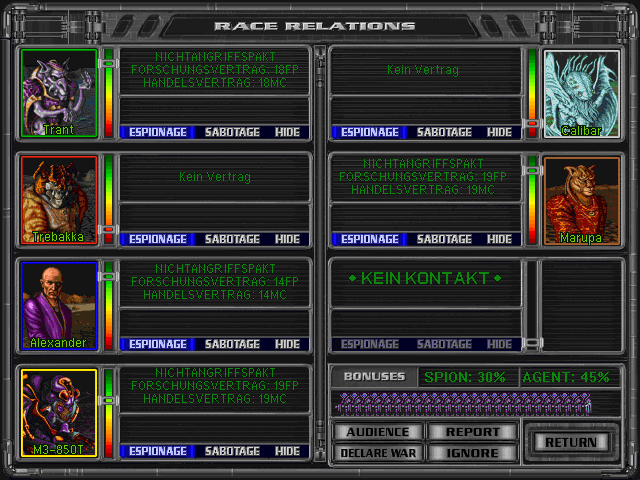 Die Beziehungen zu den nicht-abstoßenden Rassen sind bestens. Technologien werde ich in diesem Spiel wohl nur wenige tauschen, denn ich habe alles selbst.