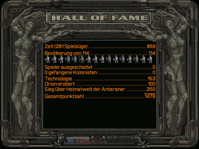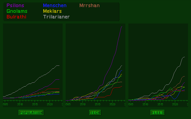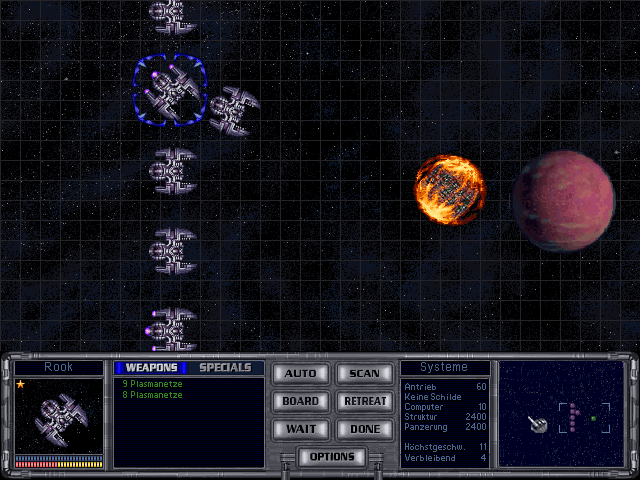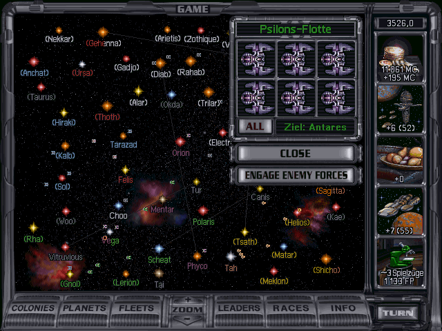 Es hat Ewigkeiten gedauert, bis das erste Schlachtschiff gebaut war, davor hatte ich 50 Züge lang die schwächste aller Flotten, bestehend nur aus einem Kreuzer. Das hätte man sicherlich anders machen müssen, z.B. durch den parallelen Bau je eines Kreuzers auf den beiden Planeten statt Bau eines Schlachtschiffs auf einem. Wie auch immer, bei vorsichtigem Auftreten ist die Wahrscheinlichkeit nicht gering, dass so etwas gut geht, und hier ist es gut gegangen.