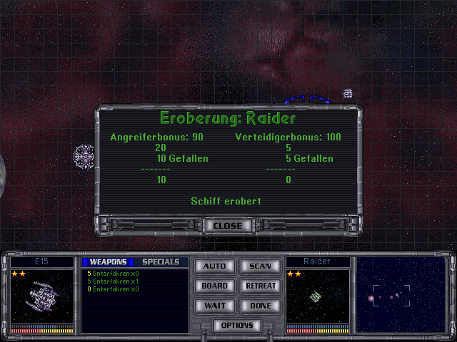 Die Antaraner greifen an, sie kommen mit drei Fregatten. Dank Xentroniumpanzerung und Plasmagewehr liegt meine Bodenkampfstärke bei unglaublichen 90. Ein einziges Schlachtschiff mit Enterfähren sollte genügen, um alle drei Schiffe zu kapern.