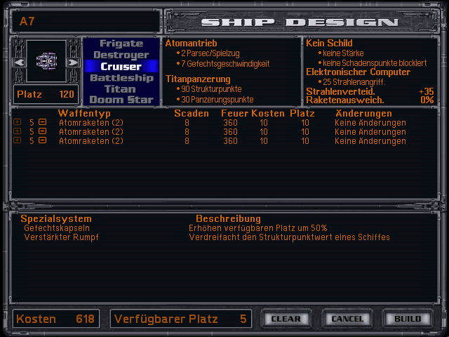 Für eine schnelle Expansion muss ich den Eindruck erwecken, die neuen Kolonien verteidigen zu können. Dafür braucht es Schiffe. Ich kann nicht auf Waffen und Panzerungen warten, die tatsächlich für eine Schlacht taugen. Sofort mit Verfügbarkeit der Gefechtskapseln baue ich diese bessere Attrappe. Sie kann später billig zu einem echten Schiff aufgerüstet werden.