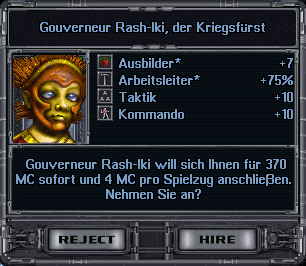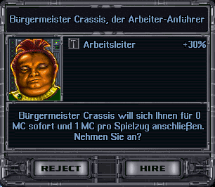 Der dritte Arbeitsleiter, und was für einer. Als Gouverneur erlebt man Rash-Iki selten. Da ich Ralleia behalten möchte, weil ich keinen Wissenschaftsleiter habe und sie als einziger Kolonieleiter einen Nutzen in einer Forschungskolonie hat, muss jetzt einer der vielen Arbeitsleiter seinen Hut nehmen. Das ist natürlich der schwächste, Crassis.