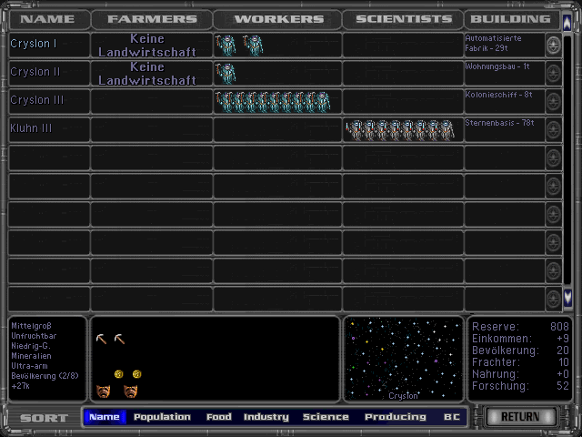 Beide Hauptplaneten sind nur ergiebig, deshalb ist es in diesem Spiel relativ frei, wie sie sich spezialisieren. Einer bekommt Ralleia und forscht, der andere bekommt Crassis und produziert.