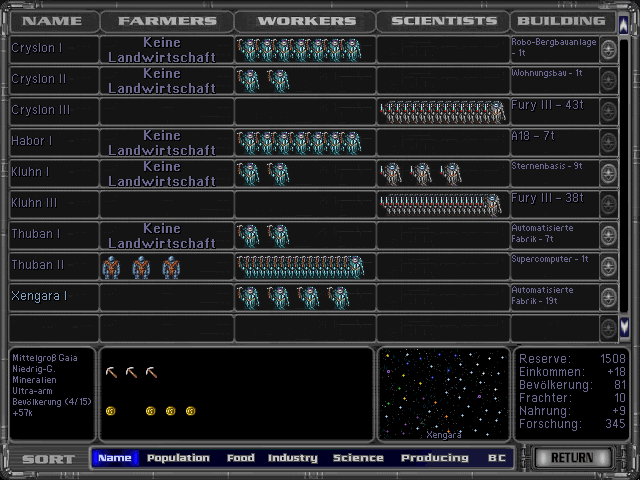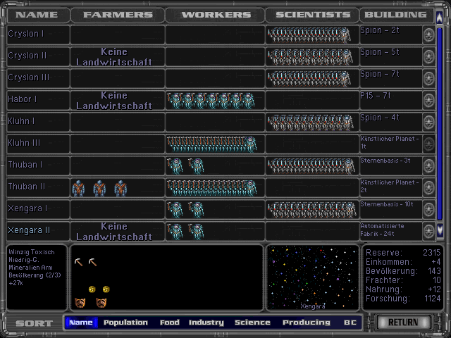 Die Systeme Kluhn, Xengara und Thuban wirken, als wäre das Monster vergessen worden, von den Bodenschätzen mal abgesehen. Ich reserviere diese Planeten schnell mit Außenposten. Kurios, dass die Galaxis gerade dann so fruchtbar ist, wenn man es am wenigsten braucht.