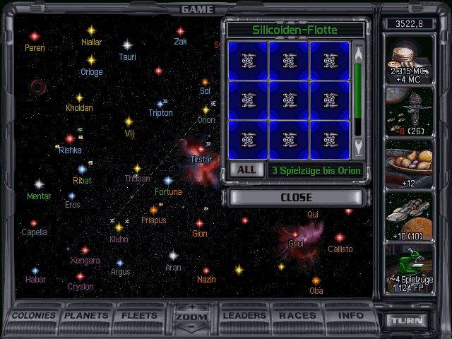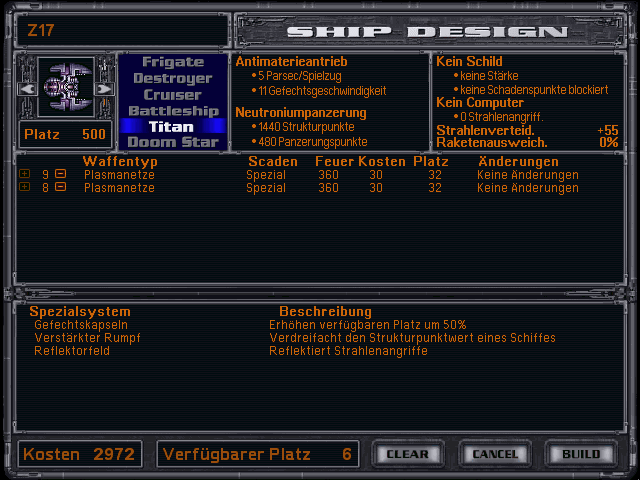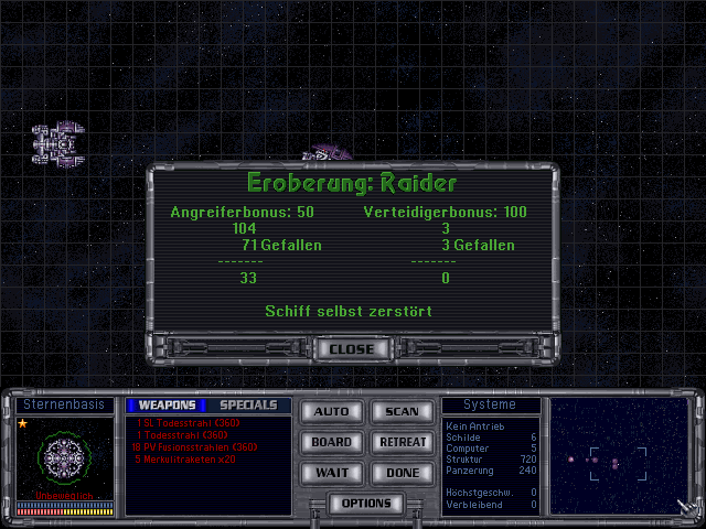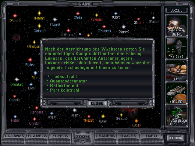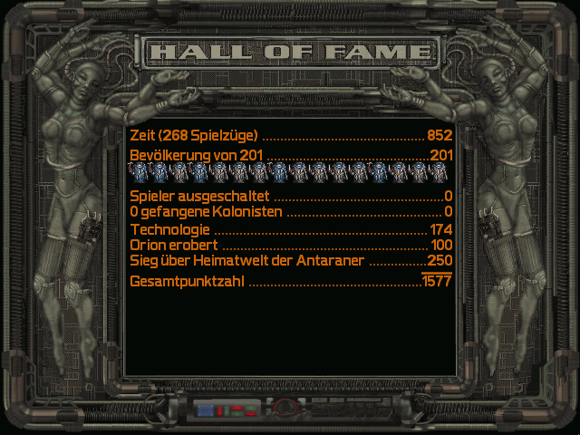 Zusätzlich zum Genannten gibt es Deckungsvorrichtung und Langstreckenzielvorrichtung. Keine der Technologien nützt etwas. Um die Antaraner zu besiegen, brauche ich jetzt noch das Dimensionsportal, eine bessere Panzerung und einen ganzen Haufen von Titanen. Letzteres sollte mit Rash-Iki und der ultra-reichen Orion-Kolonie kein Problem sein.