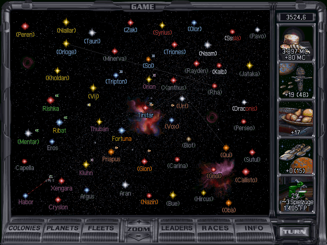 Die Galaxis nach 164 Zügen. Aus den ehemaligen Außenposten bei Xengara und Thuban sind Kolonien geworden. Die Nachbarn verhalten sich ruhig.