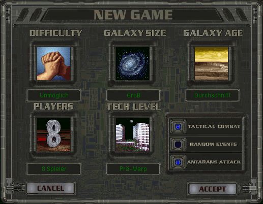Das Setup. Große Galaxis, 8 Rassen. Die große Galaxis bringt eine hohe Dichte an Monstern mit, was eine Voraussetzung ist für meine Anfangsstrategie. Nicht zu sehen: Schiffsinitiative ist in den Optionen aktiviert. Ich beginne Prä-Warp.
