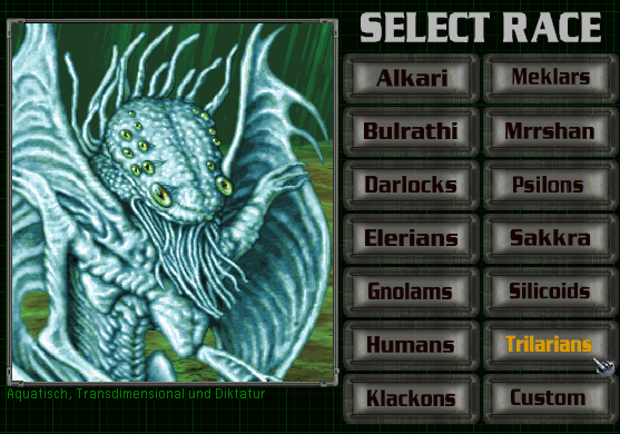 Ich verzichte auf eine durchoptimierte Custom Race an der Grenze zur Schummelei und spiele mit einem der Standardvölker. Es sollen die Trilarianer sein. Prinzipiell stehen die Chancen gut, wenn die Rasse einen Nahrungs- oder Forschungsbonus hat. Die Trilarianer sind aquatisch und haben somit indirekt einen Nahrungsbonus auf allen terranischen und ozeanischen Planeten einschließlich ihrer Heimatwelt.