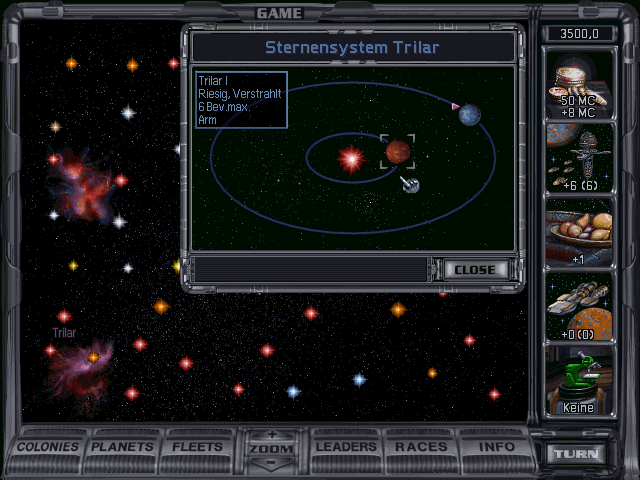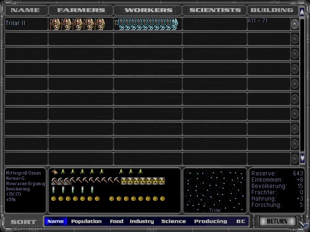 Der Planet ist für Drachen-Verhältnisse fast schon enttäuschend, nur groß und nur reich. Das Gaia-Klima nützt mir mit einer aquatischen Rasse nichts. Immerhin startet er mit den Eingeborenen gleich mit vier Kolonisten, und sie sind in der Landwirtschaft produktiver, als es meine Trilarianer wären.