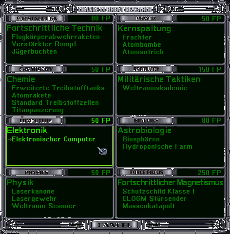 Ich versuche nicht, möglichst schnell möglichst viele Systeme zu besiedeln, sondern beginne zunächst damit, meine Wirtschaft zu stärken. Dass es in der Nähe meiner Heimatwelt einen guten Planeten ohne Monster gibt, ist ziemlich unwahrscheinlich, und die üblichen 5-Kolonisten-Planeten sind es nicht wert, sich mit einer schwachen Wirtschaft in ein Wettrennen um sie zu stürzen und damit viel Zeit zu verlieren. Ich gehe von der Vermutung aus, dass die guten Planeten durch Monster vor früher Besiedlung durch die KI geschützt werden. Ich beginne also die Forschung mit Elektronischem Computer, Forschungslabor, Biosphären, Verstärktem Rumpf und Automatisierter Fabrik. Alle erforschten Einrichtungen werden in der Kolonie gebaut. Erst nach diesen wirtschaftlichen Verbesserungen sind dann die Raumschiff-Basistechnologien an der Reihe. Normalerweise würde ich zuvor sogar noch die Bodenanreicherung entwickeln und anwenden, da aber die Trilarianer als aquatische Rasse auf ihrem Heimatplaneten schon eine gesteigerte Nahrungsproduktion haben, kann das warten.