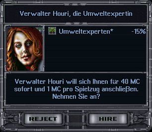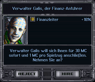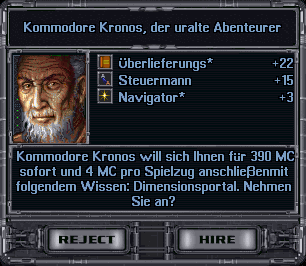 Da ist mein Navigator. Kronos bringt neben der Navigation noch das Dimensionsportal mit, sowie drittens die Überlieferung, d.h. sofort nach seiner Anstellung kenne ich die gesamte Galaxis. Aber erst einmal muss er 29 Züge warten, was mir über 100 Credits spart.