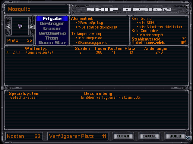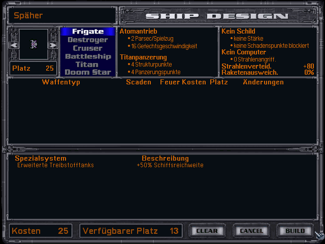 Nach ereignisarmen 50 Zügen ist der Teil, der mit meiner Vorgehensweise in jedem Spiel fast gleich abläuft, vorbei. Ich kann jetzt ein Schiff bauen, um nach geeigneten Planeten für Kolonien zu suchen. Das kleinste mögliche Schiff reicht aus, eine Fregatte. Waffen und Computer kosten nur Aufwand und bringen im Moment noch nichts, das einzig Wichtige sind die erweiterten Treibstofftanks. In der Forschung geht es weiter mit Tritanpanzerung und Verschmutzungsprozessor. Tritan bedeutet, auf Deuterium-Treibstoffzellen zunächst zu verzichten. Letztendlich braucht man beides, aber eine Treibstoffzellentechnik lässt sich leichter per Tausch einhandeln als eine Panzerungstechnik.
